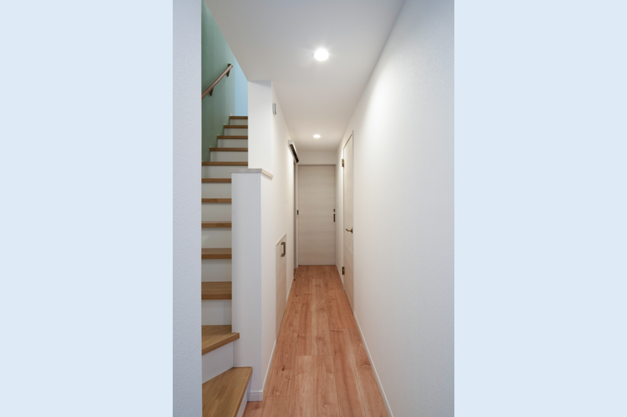 階段下にはトイレや収納スペースを設け、スペースを有効活用しています。