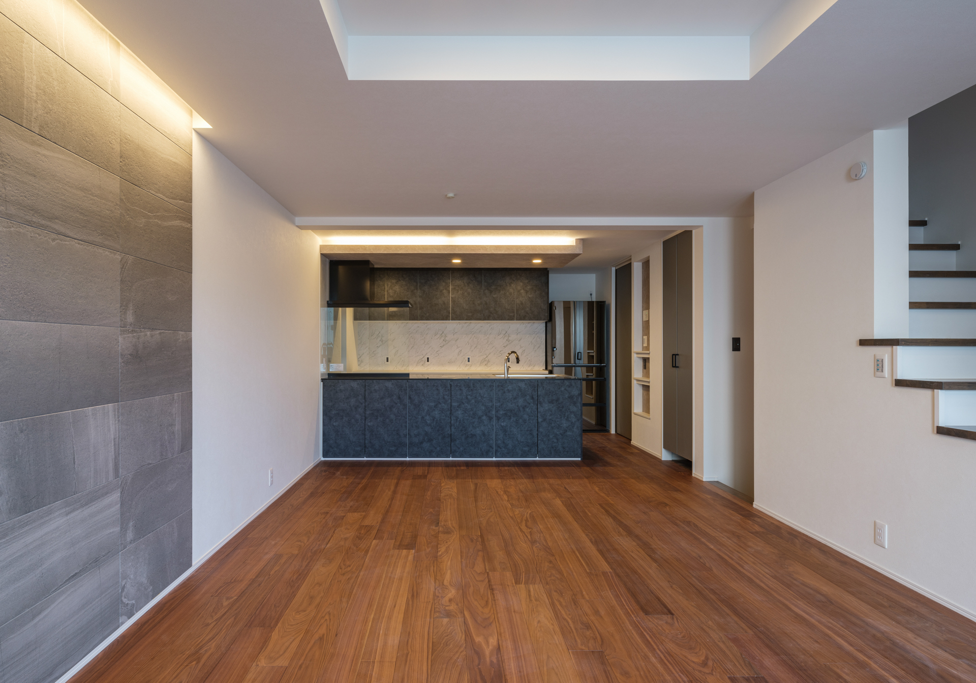 リビングは折り上げ天井、キッチンは折り下げ天井にしそれぞれ間接照明を施工しました。天井や壁を照射させることで高級感や奥行きが生まれ、開放的な空間となりました。間接照明はエコカラットの壁との相性も良く、デザイン性の高い上質で柔らかい雰囲気を演出できます。