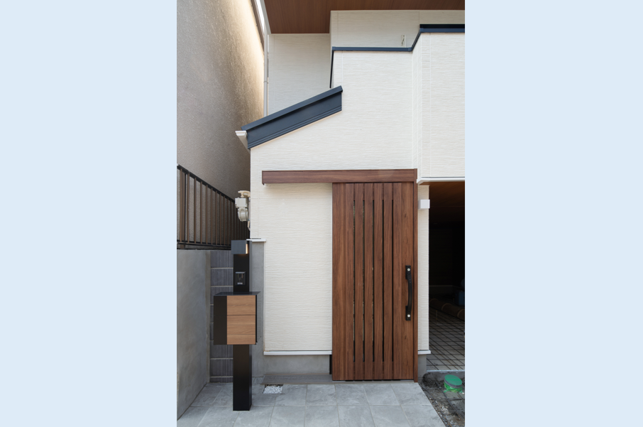 玄関ドアはリクシルのエルムーブ2防火戸L24型を採用しました。引き戸の玄関ドアはドアの開け閉めがしやすく、開けたままの荷物の出し入れがしやすいといったメリットがあります。